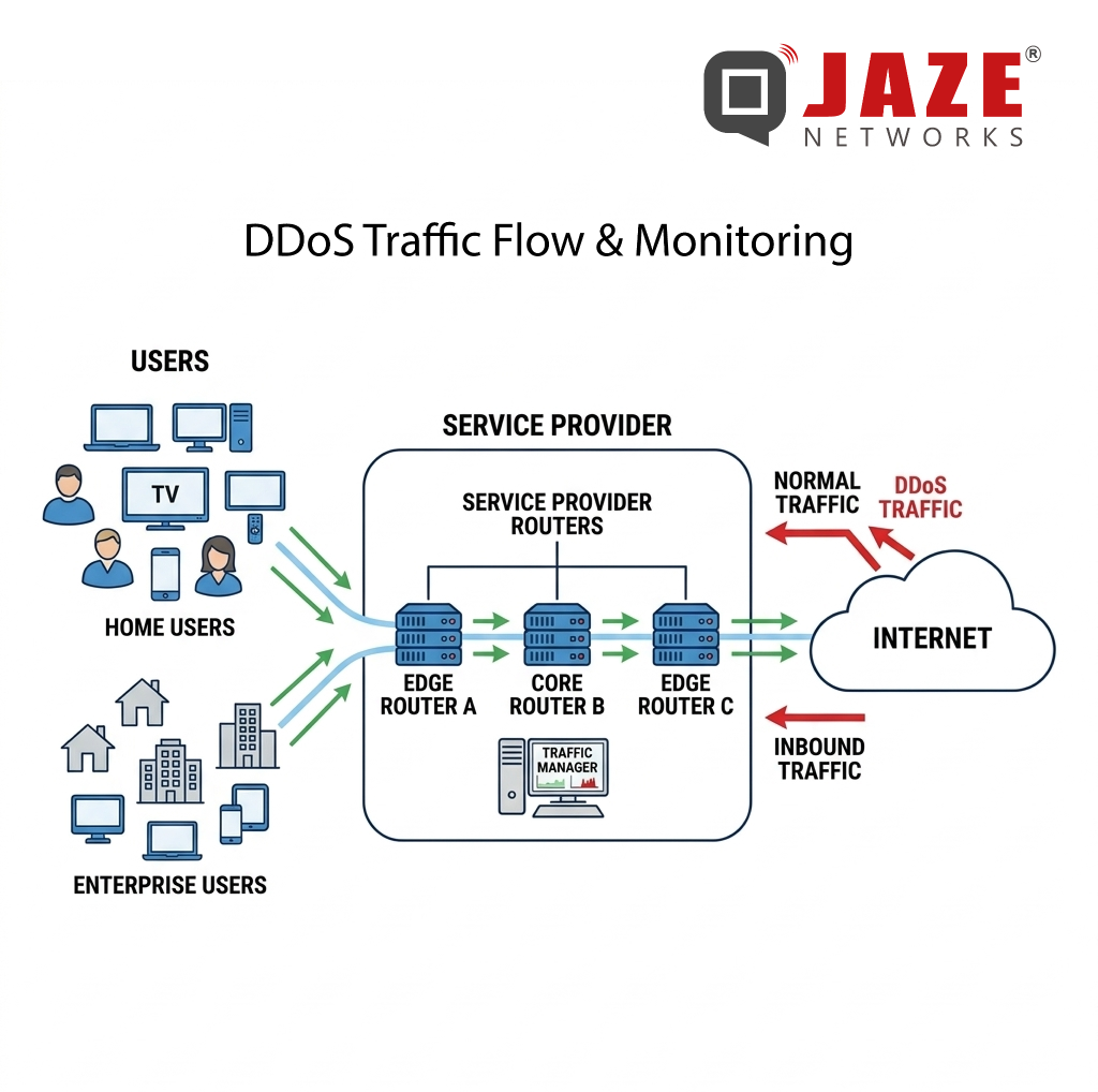 Jaze ISP Manager provides scalable IPFIX logging which can be integrated with DDoS protection systems for real-time DDoS detection and mitigation. In integration with BGP routers supporting RTBH and BGP Flowspec , ISPs can detect, respond to, and neutralise DDoS attacks before service is disrupted — keeping subscribers connected and SLAs intact.